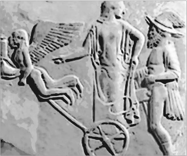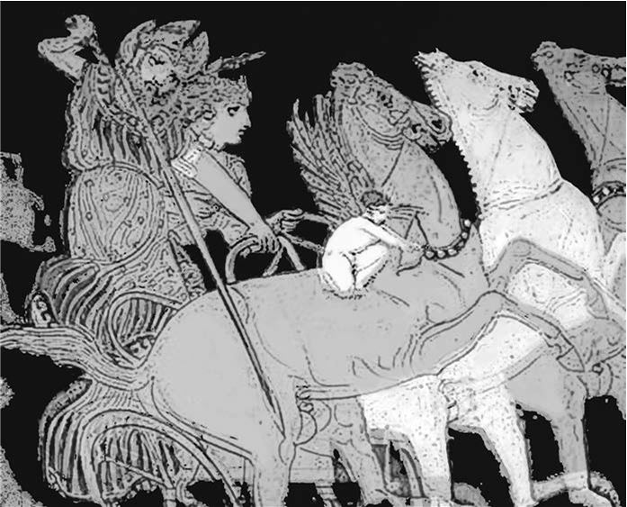 Еще один связанный с Афродитой мужской образ – бог Гермес (рис. 96), проводник к бессмертию. Это энергия шакти, которая вдохновляет и на бой, и на поиск духовного просветления. Маленькую повозку Гермеса везут два коня, которых зовут Эрос и Психея.