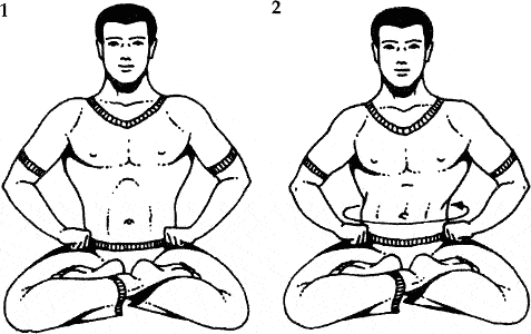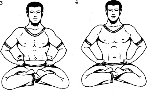 Вдохните и задержите воздух в животе, сосредоточившись на пупочной чакре; выполняйте упражнение кумбхака, или «кувшинная задержка». Оно подразумевает легкое напряжение мышц промежности и ануса с приподниманием тазового дна. Одновременно напрягается и давит вниз диафрагма, широкий мускул, который служит дном грудной полости. Воздух задерживается между тазовым дном и диафрагмой и как бы сдавливается в пупочной чакре. Не допускайте ощущения замкнутости в горле. Сделайте дополнительный вдох и, сохраняя сосредоточение на кумбхаке, дайте жизненному воздуху распространиться внутри, словно он наполняет и питает всю середину тела.