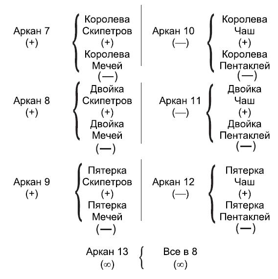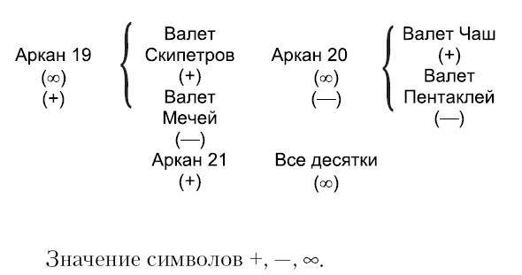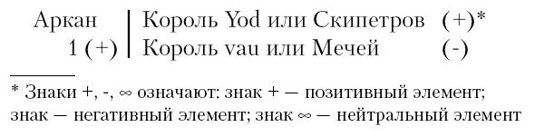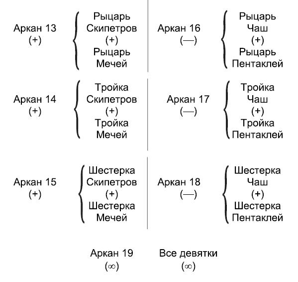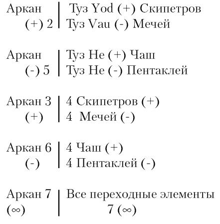 То же правило применяется и к другим элементам, в комбинировании знака, прикрепленного к большому аркану с тем, который прикреплен к рассматриваемому элементу.